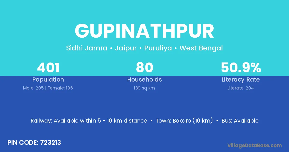 Bokaro (10 km) is the nearest town to Gupinathpur village for major economic activities and is located approximately 10 km away.