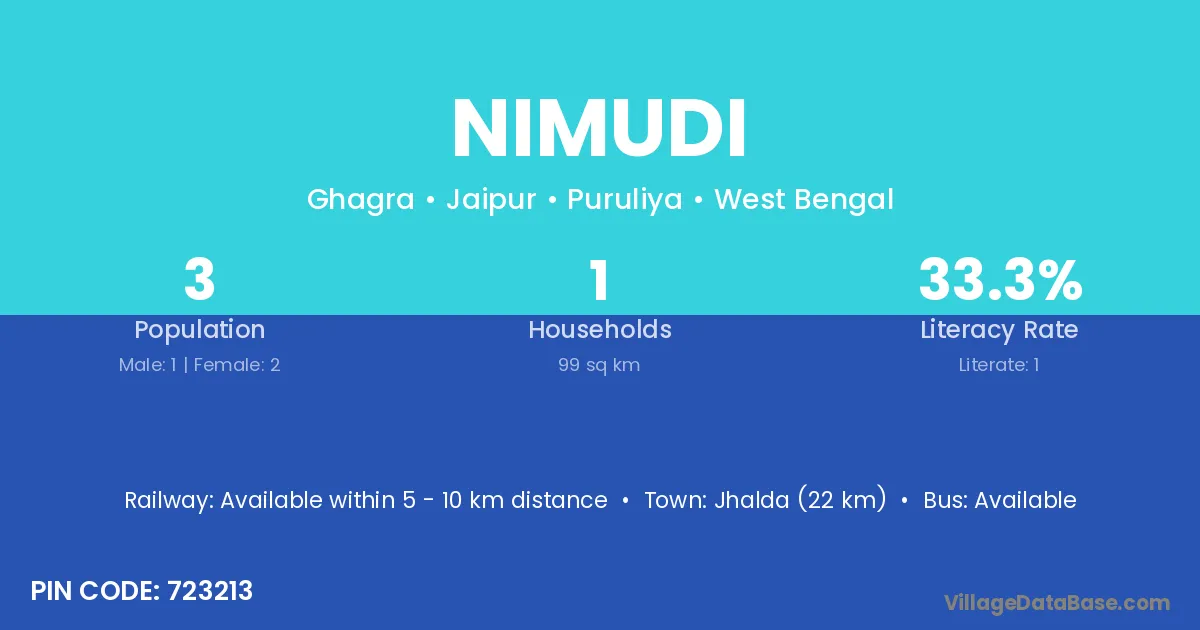 Jhalda (22 km) is the nearest town to Nimudi village for major economic activities and is located approximately 22 km away.