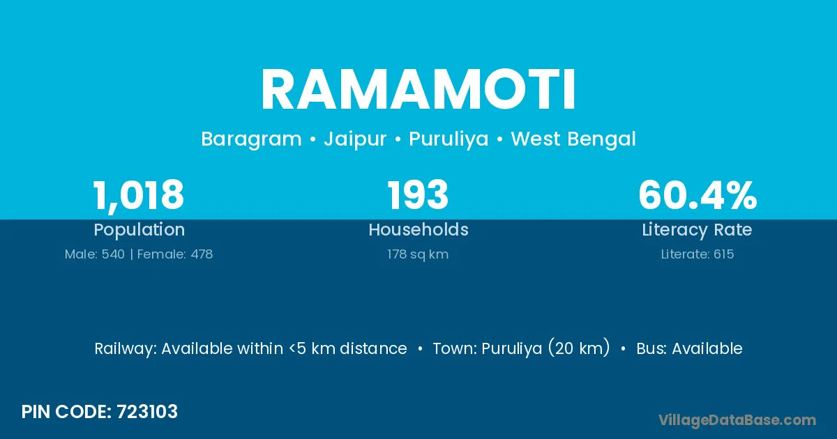 Puruliya (20 km) is the nearest town to Ramamoti village for major economic activities and is located approximately 20 km away.