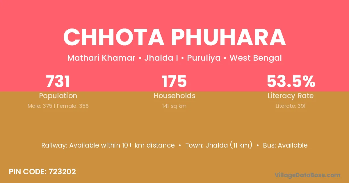 Jhalda (11 km) is the nearest town to Chhota Phuhara village for major economic activities and is located approximately 11 km away.