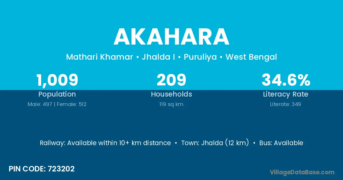 Jhalda (12 km) is the nearest town to Akahara village for major economic activities and is located approximately 12 km away.