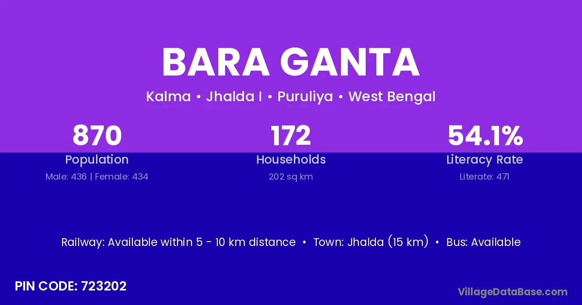 Jhalda (15 km) is the nearest town to Bara Ganta village for major economic activities and is located approximately 15 km away.
