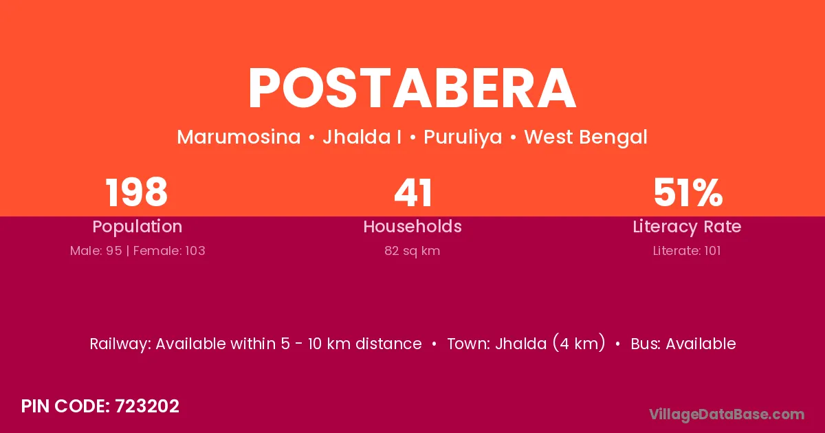 Jhalda (4 km) is the nearest town to Postabera village for major economic activities and is located approximately 4 km away.