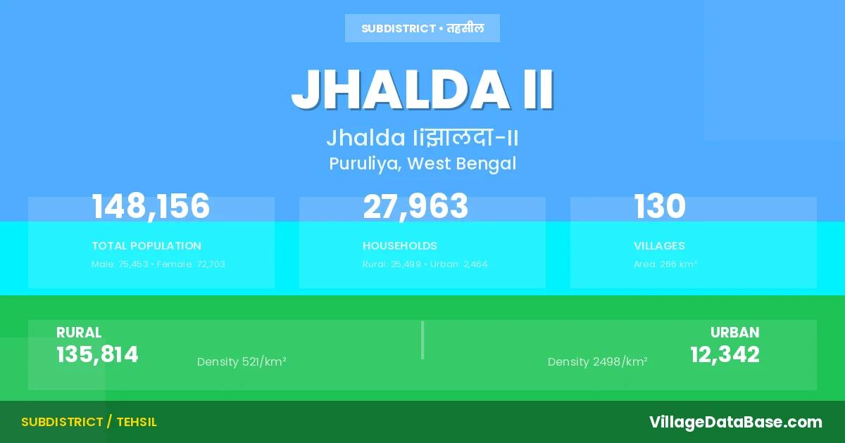 According to the 2011 census The total area of Jhalda II Subdivision is 266 km², with a population of 148156 people. The population density is 558 inhabitants per square kilometre, and there are approximately 27963 houses in the sub district.