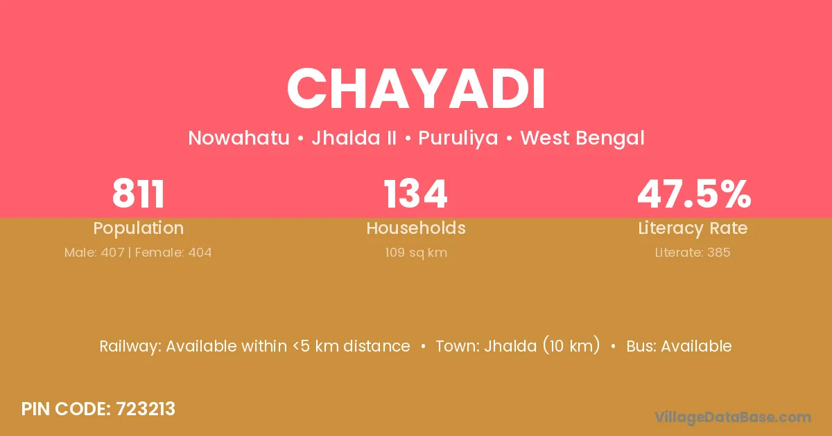 Jhalda (10 km) is the nearest town to Chayadi village for major economic activities and is located approximately 10 km away.