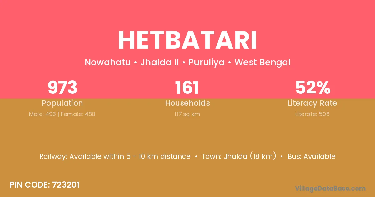 Jhalda (18 km) is the nearest town to Hetbatari village for major economic activities and is located approximately 18 km away.