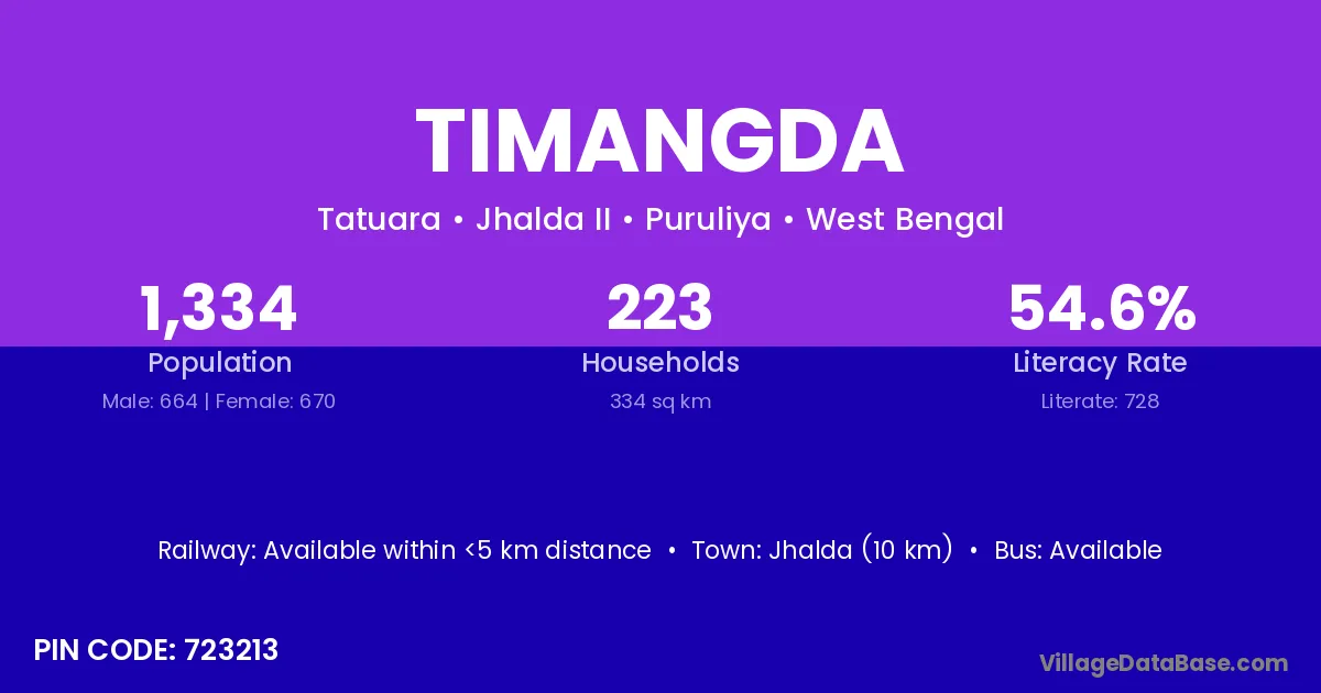 Jhalda (10 km) is the nearest town to Timangda village for major economic activities and is located approximately 10 km away.