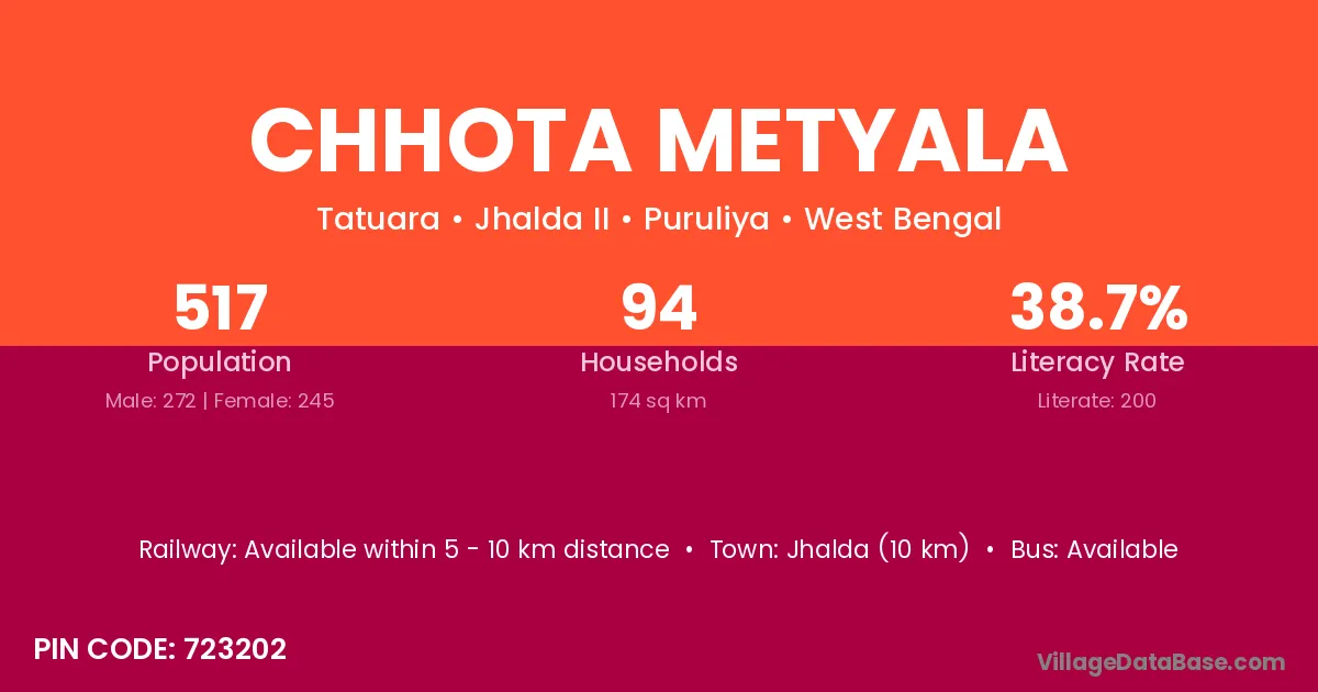 Chhota Metyala village is located in the Jhalda II Subdivision of the Puruliya district in West Bengal.