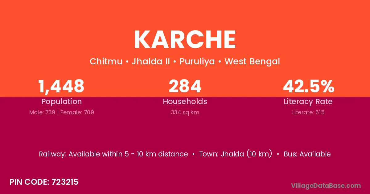 Jhalda (10 km) is the nearest town to Karche village for major economic activities and is located approximately 10 km away.