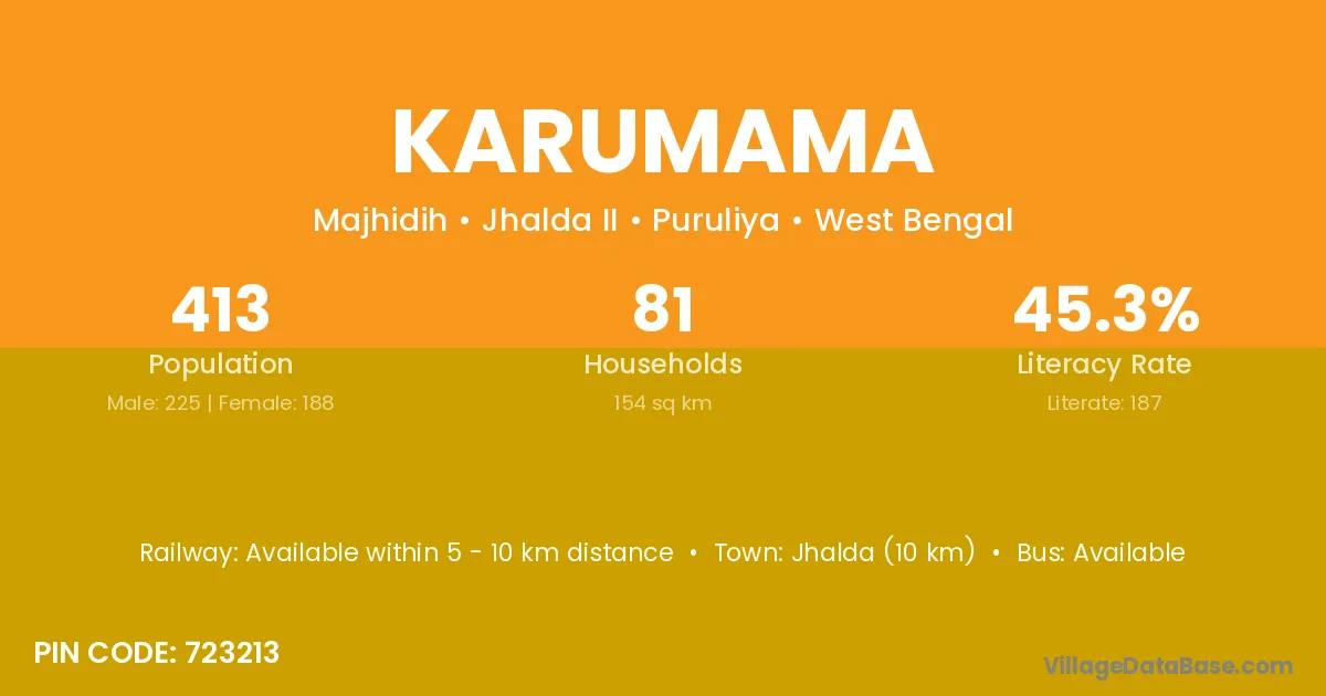 Jhalda (10 km) is the nearest town to Karumama village for major economic activities and is located approximately 10 km away.