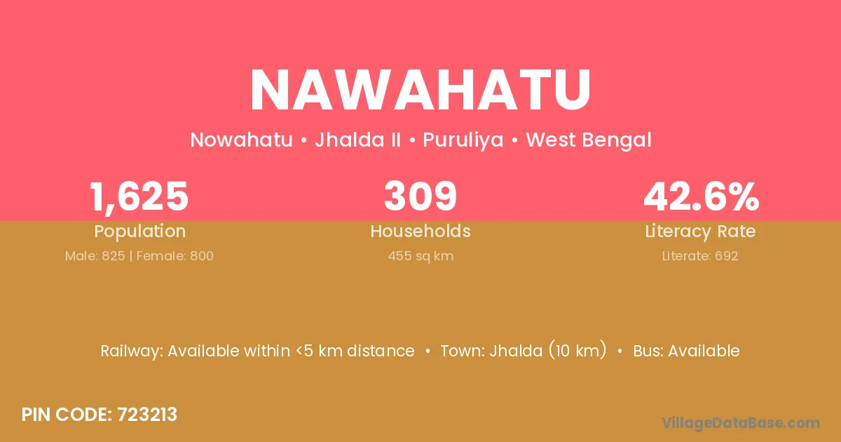 Jhalda (10 km) is the nearest town to Nawahatu village for major economic activities and is located approximately 10 km away.