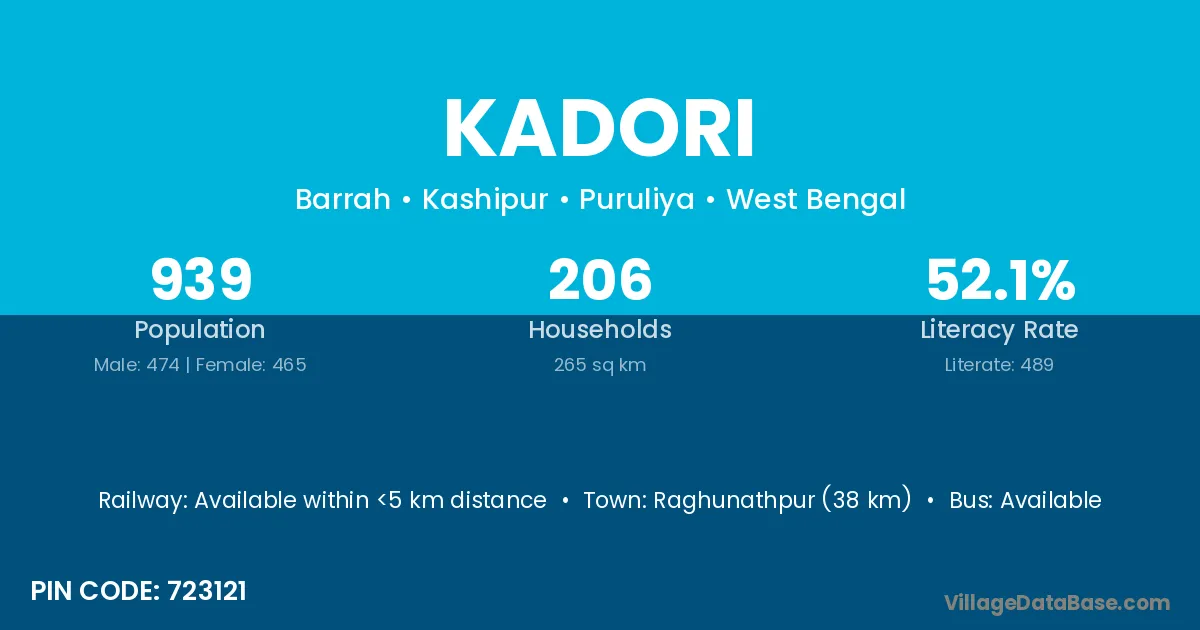 Raghunathpur (38 km) is the nearest town to Kadori village for major economic activities and is located approximately 38 km away.