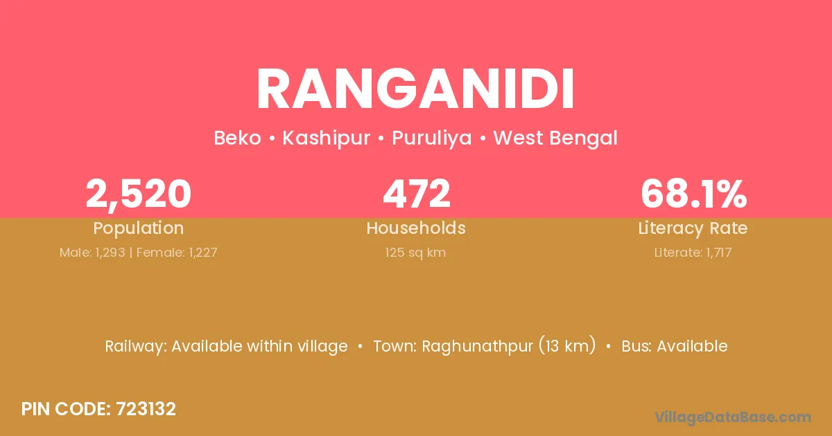 Raghunathpur (13 km) is the nearest town to Ranganidi village for major economic activities and is located approximately 13 km away.