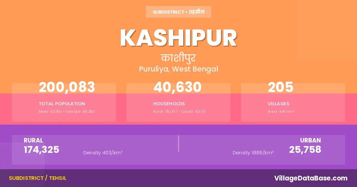 According to the 2011 census The total area of Kashipur Subdivision is 446 km², with a population of 200083 people. The population density is 448 inhabitants per square kilometre, and there are approximately 40630 houses in the sub district.