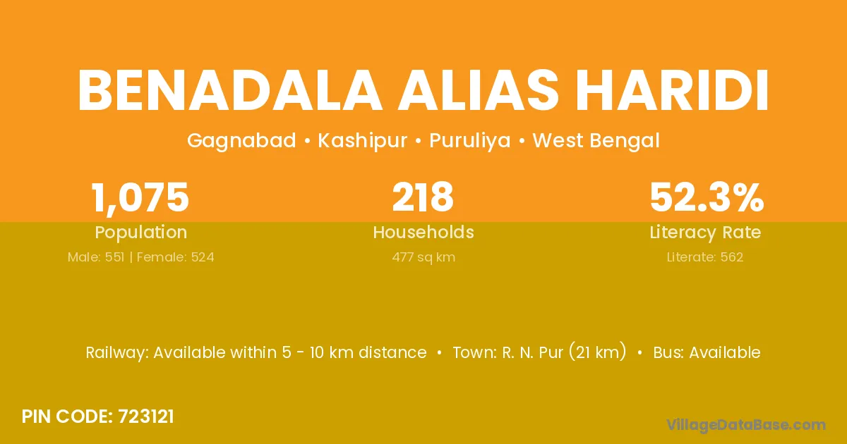 Benadala Alias Haridi village has a total population of 1,075 people, of which 551 are males and 524 are females.