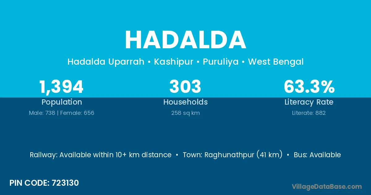 Raghunathpur (41 km) is the nearest town to Hadalda village for major economic activities and is located approximately 41 km away.