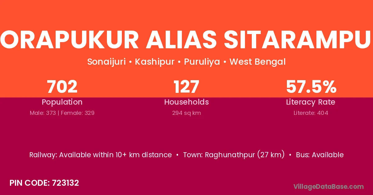 Raghunathpur (27 km) is the nearest town to Jorapukur Alias Sitarampur village for major economic activities and is located approximately 27 km away.