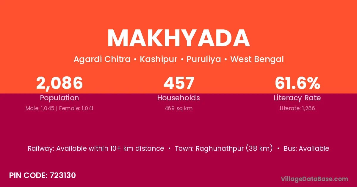 Raghunathpur (38 km) is the nearest town to Makhyada village for major economic activities and is located approximately 38 km away.