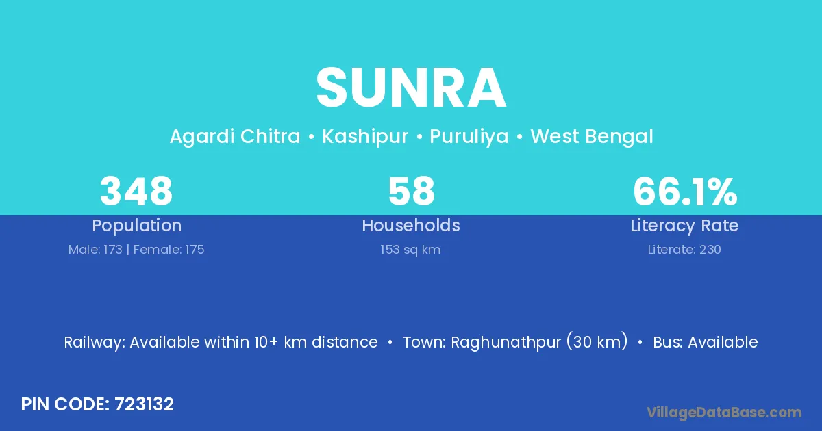 Raghunathpur (30 km) is the nearest town to Sunra village for major economic activities and is located approximately 30 km away.