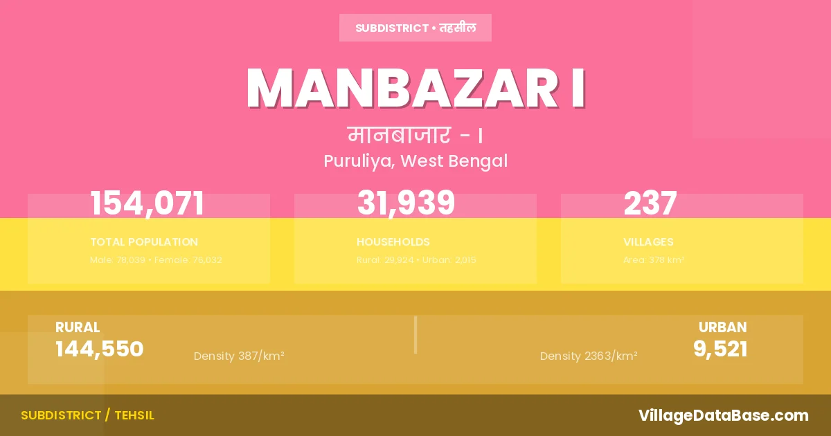 According to the 2011 census The total area of Manbazar I Subdivision is 378 km², with a population of 154071 people. The population density is 408 inhabitants per square kilometre, and there are approximately 31939 houses in the sub district.