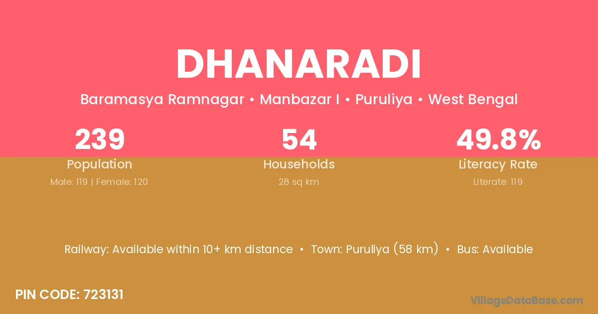 Dhanaradi village is located in the Manbazar I Subdivision of the Puruliya district in West Bengal.