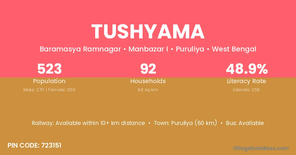Puruliya (60 km) is the nearest town to Tushyama village for major economic activities and is located approximately 60 km away.