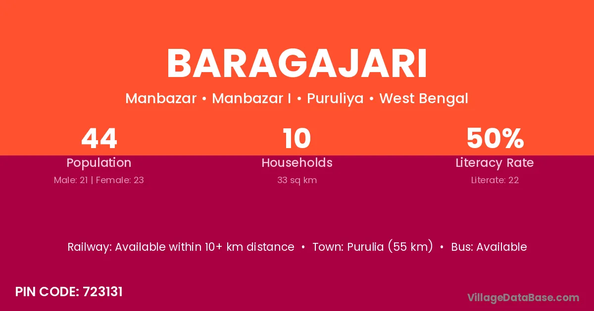 Purulia (55 km) is the nearest town to Baragajari village for major economic activities and is located approximately 55 km away.