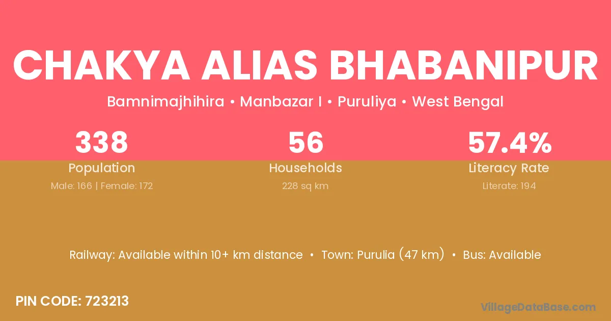 Purulia (47 km) is the nearest town to Chakya Alias Bhabanipur village for major economic activities and is located approximately 47 km away.