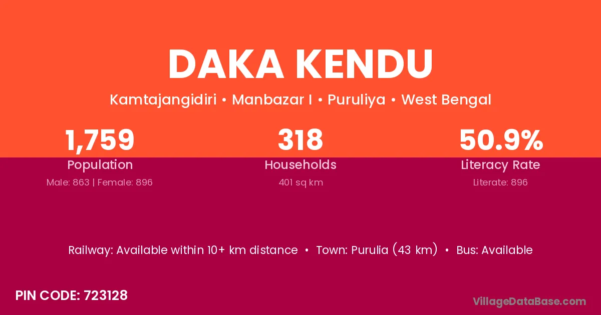 Purulia (43 km) is the nearest town to Daka Kendu village for major economic activities and is located approximately 43 km away.