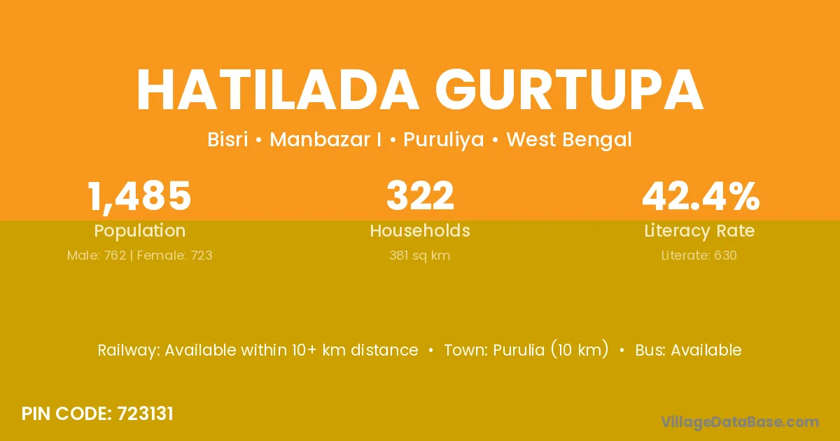 Purulia (10 km) is the nearest town to Hatilada Gurtupa village for major economic activities and is located approximately 10 km away.
