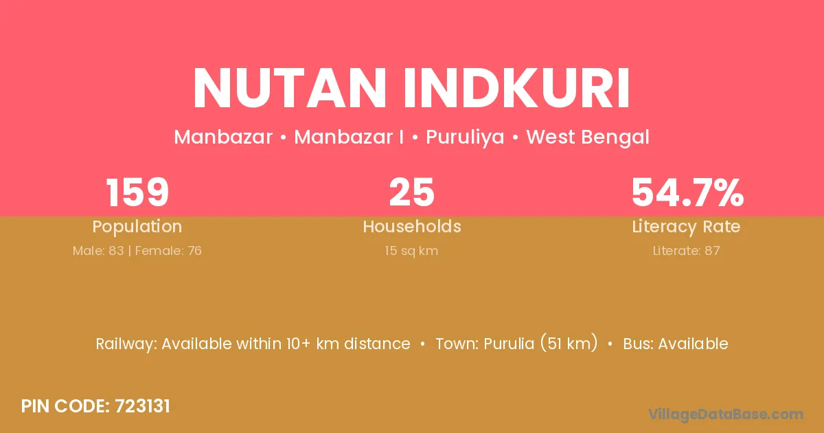 Purulia (51 km) is the nearest town to Nutan Indkuri village for major economic activities and is located approximately 51 km away.