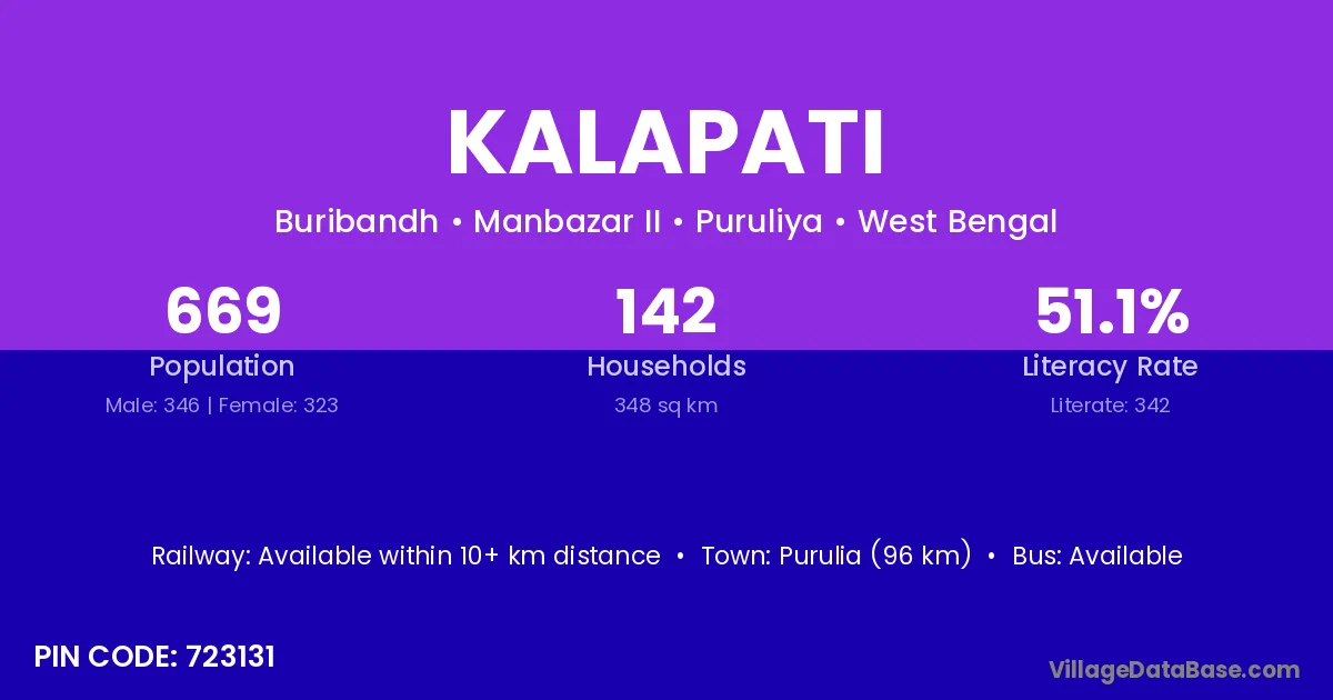 Purulia (96 km) is the nearest town to Kalapati village for major economic activities and is located approximately 96 km away.
