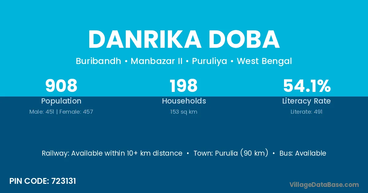Purulia (90 km) is the nearest town to Danrika Doba village for major economic activities and is located approximately 90 km away.