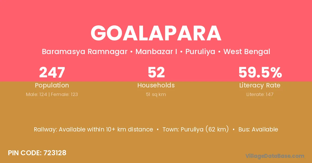 Goalapara village is located in the Manbazar II Subdivision of the Puruliya district in West Bengal.