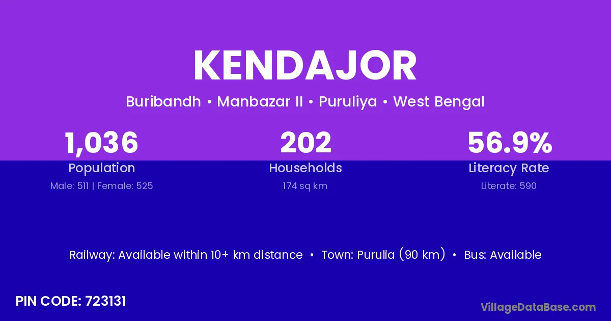 Purulia (90 km) is the nearest town to Kendajor village for major economic activities and is located approximately 90 km away.