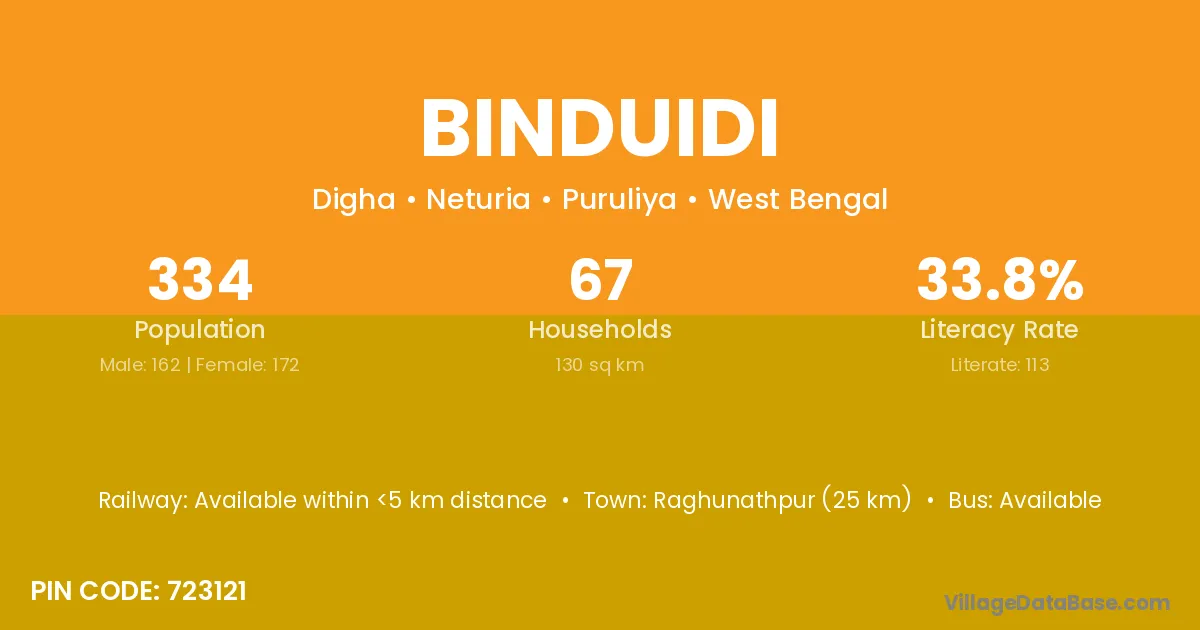 Raghunathpur (25 km) is the nearest town to Binduidi village for major economic activities and is located approximately 25 km away.