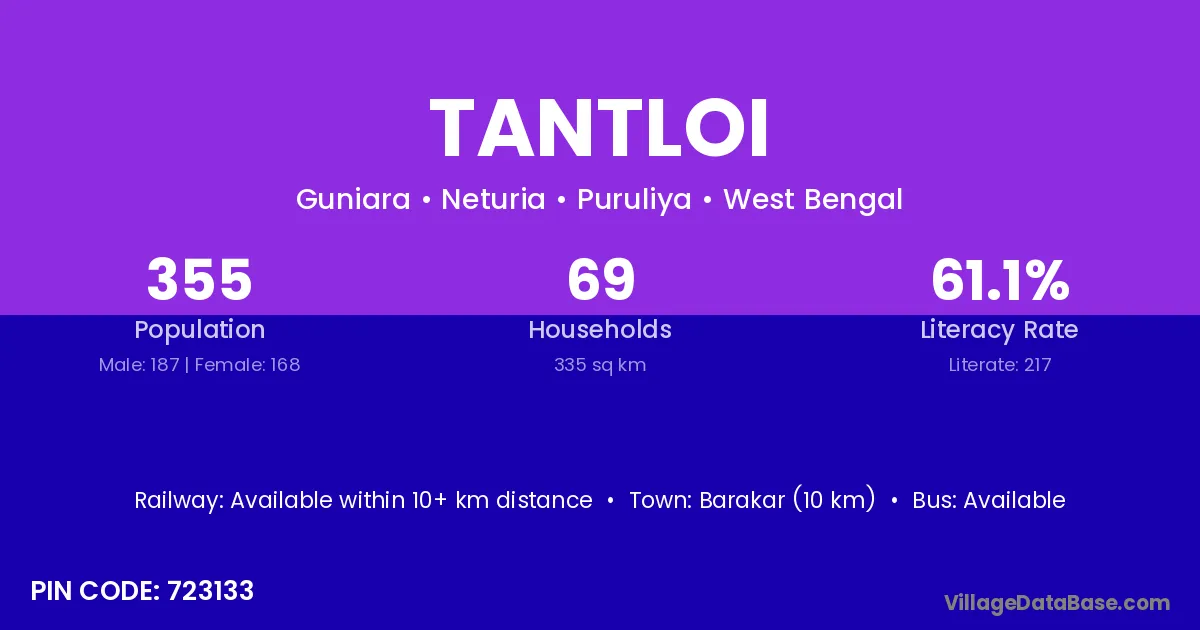 Barakar (10 km) is the nearest town to Tantloi village for major economic activities and is located approximately 10 km away.