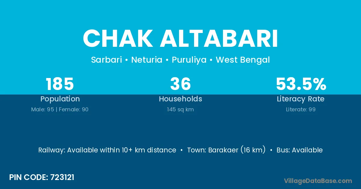 Chak Altabari village has a total population of 185 people, of which 95 are males and 90 are females.