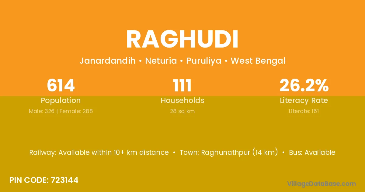 Raghunathpur (14 km) is the nearest town to Raghudi village for major economic activities and is located approximately 14 km away.