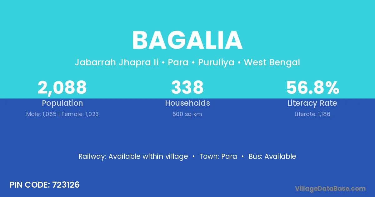 According to Census 2011 information, the village code of Bagalia village is 723126.