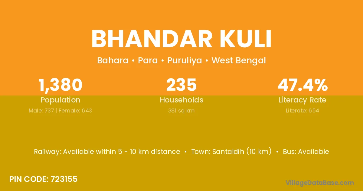 Santaldih (10 km) is the nearest town to Bhandar Kuli village for major economic activities and is located approximately 10 km away.