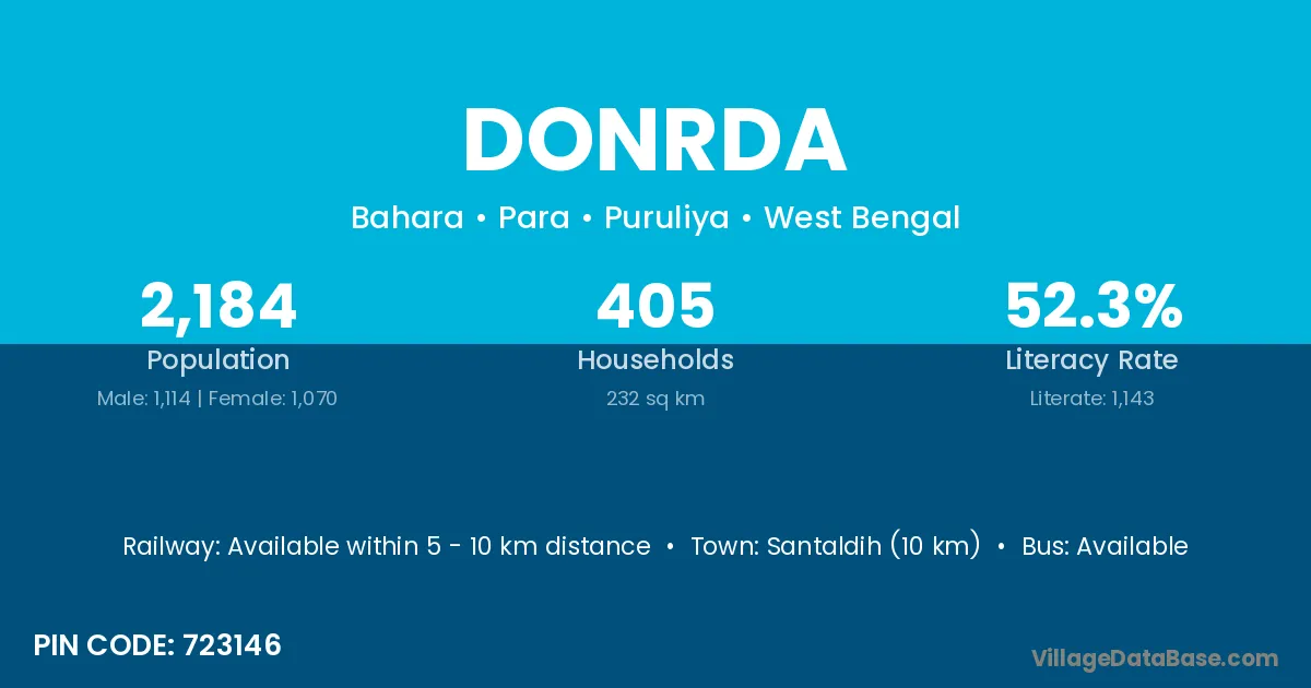 Santaldih (10 km) is the nearest town to Donrda village for major economic activities and is located approximately 10 km away.