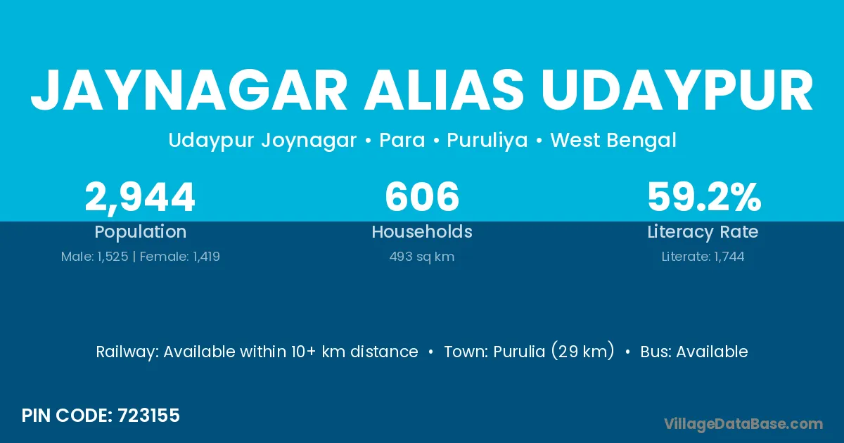 Purulia (29 km) is the nearest town to Jaynagar Alias Udaypur village for major economic activities and is located approximately 29 km away.