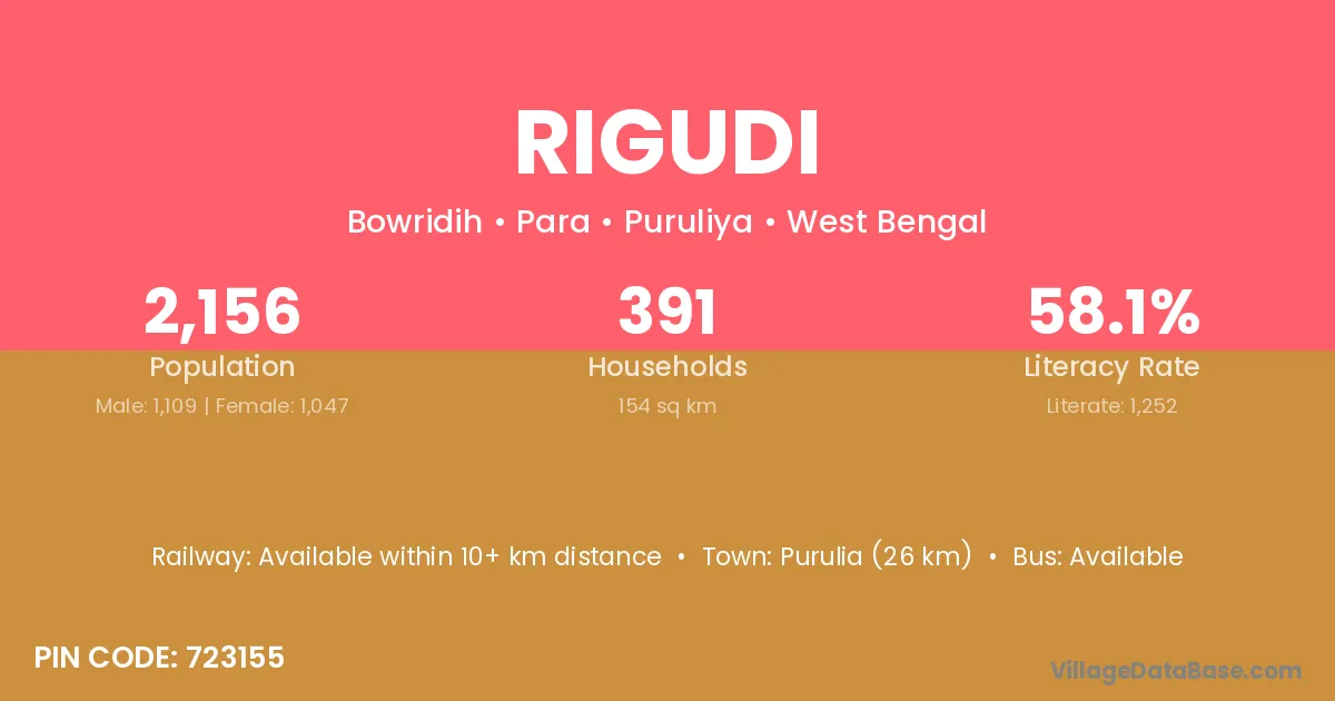 Purulia (26 km) is the nearest town to Rigudi village for major economic activities and is located approximately 26 km away.