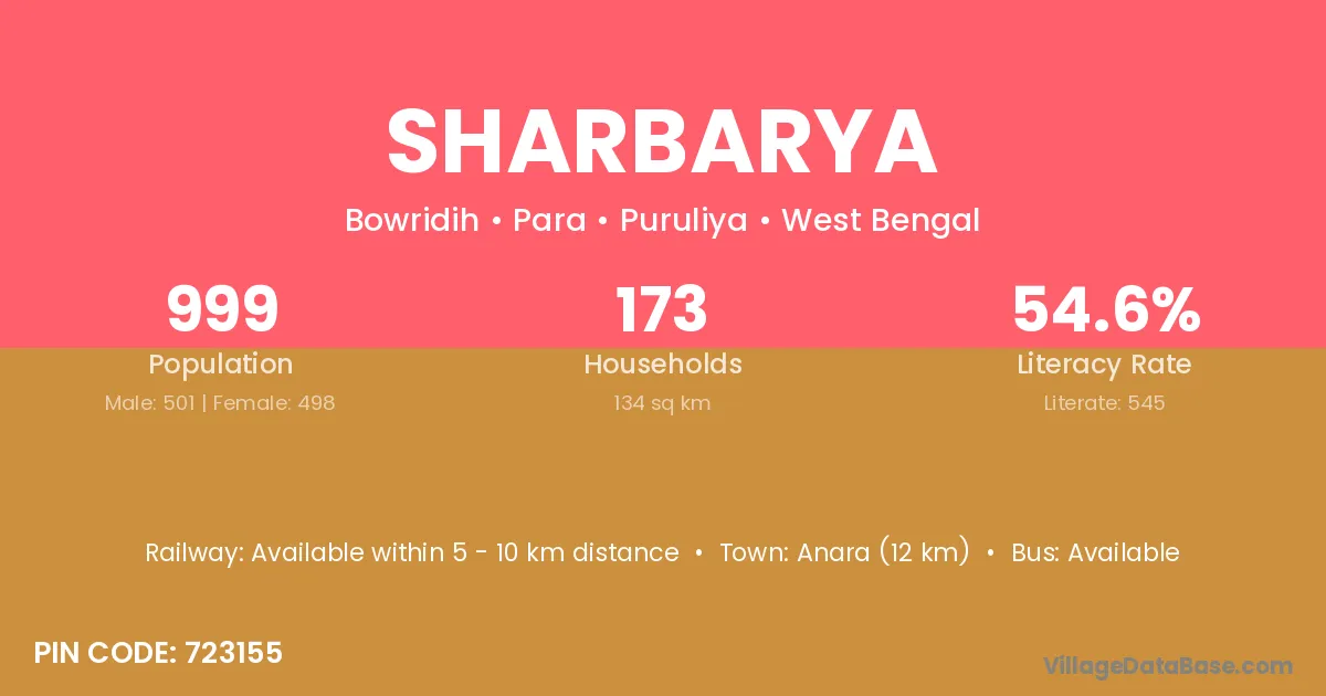 Sharbarya village has a total population of 999 people, of which 501 are males and 498 are females.