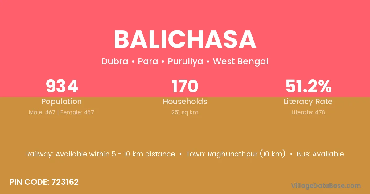 Raghunathpur (10 km) is the nearest town to Balichasa village for major economic activities and is located approximately 10 km away.