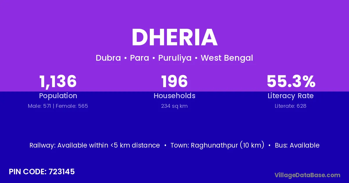 Raghunathpur (10 km) is the nearest town to Dheria village for major economic activities and is located approximately 10 km away.