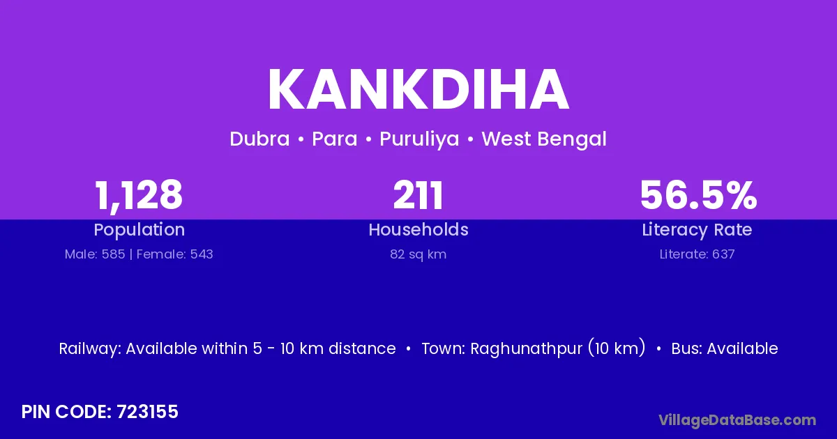 Raghunathpur (10 km) is the nearest town to Kankdiha village for major economic activities and is located approximately 10 km away.