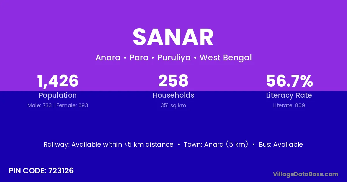 Anara (5 km) is the nearest town to Sanar village for major economic activities and is located approximately 5 km away.