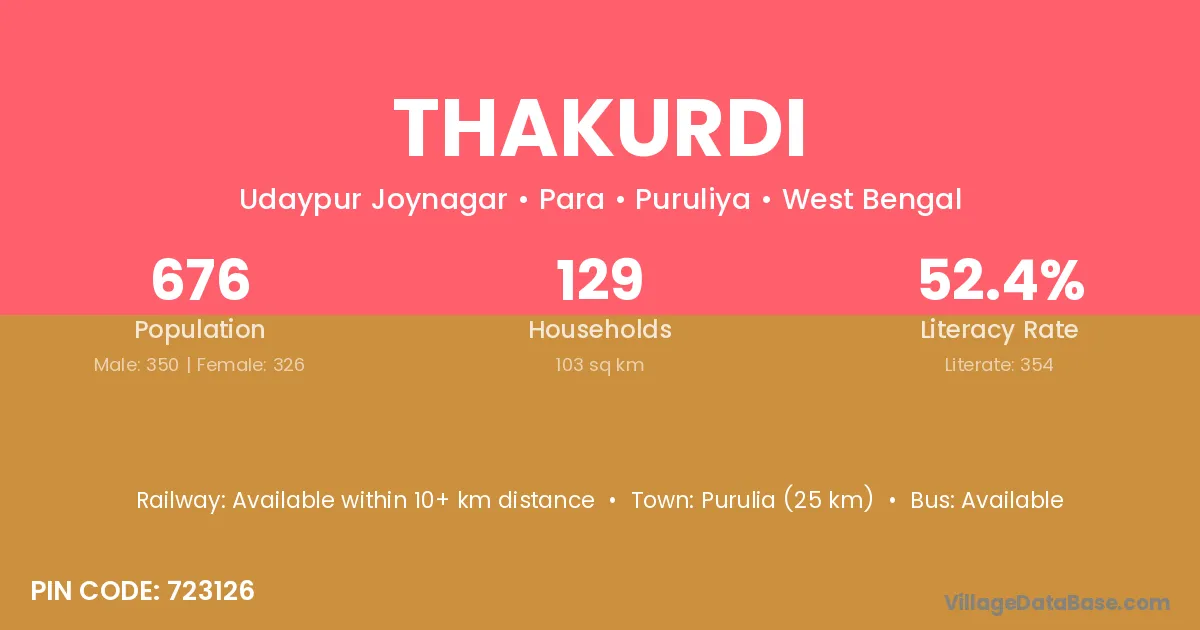 Purulia (25 km) is the nearest town to Thakurdi village for major economic activities and is located approximately 25 km away.